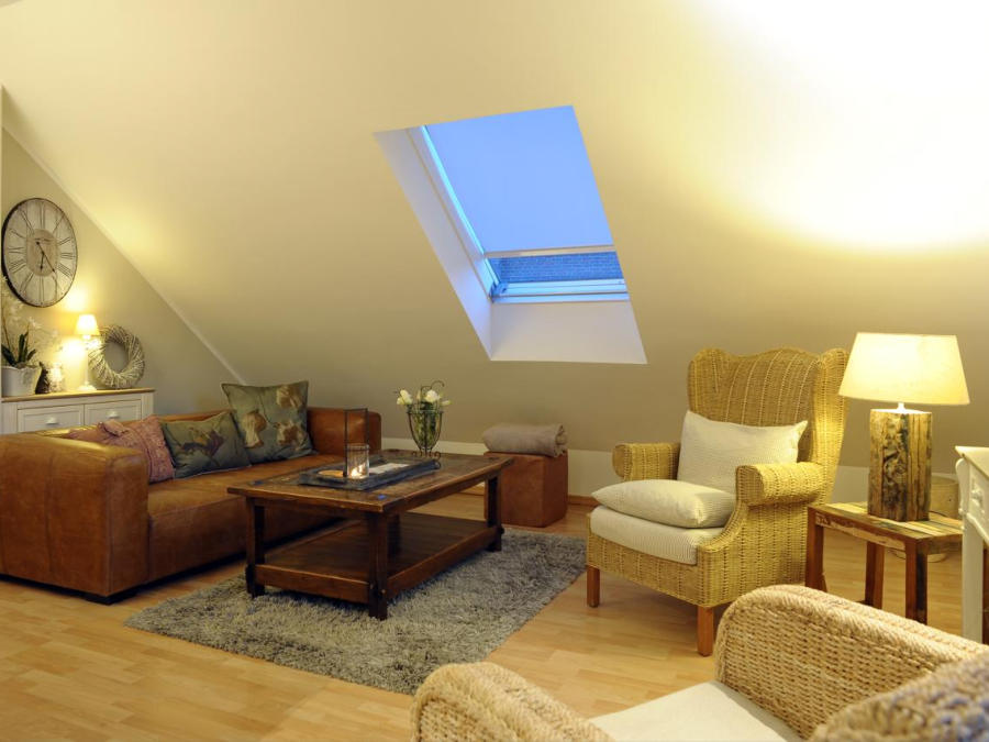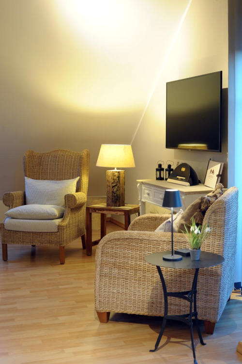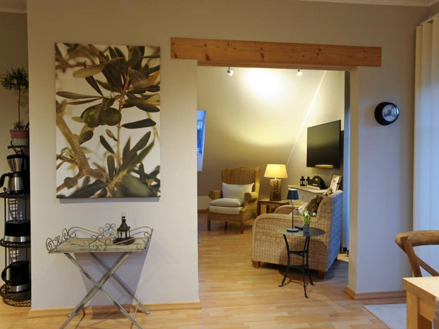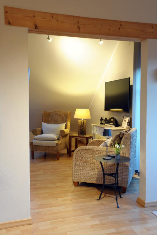 Eifel Fewo Landfein in Schalkenmehren mit Wohnzimmer inkl. HD Flachbildfernseher und Schlafcouch.