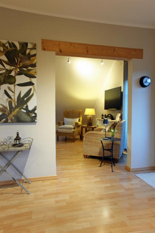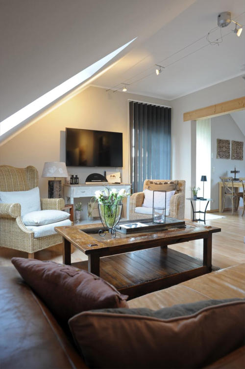 Eifel Fewo Landfein in Schalkenmehren mit Wohnzimmer inkl. HD Flachbildfernseher und Schlafcouch.