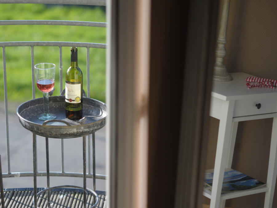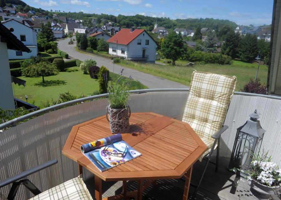 Ferienwohnung in Schalkenmehren mit Balkon, begehbar von Wohnzimmer und Küche.